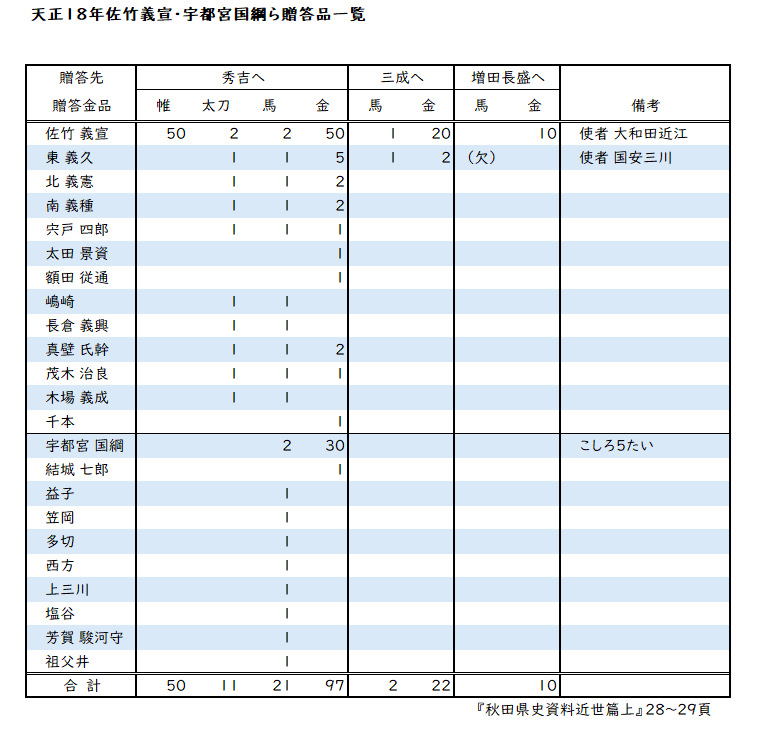 表. 佐竹義宣・宇都宮国綱らの秀吉への贈答品