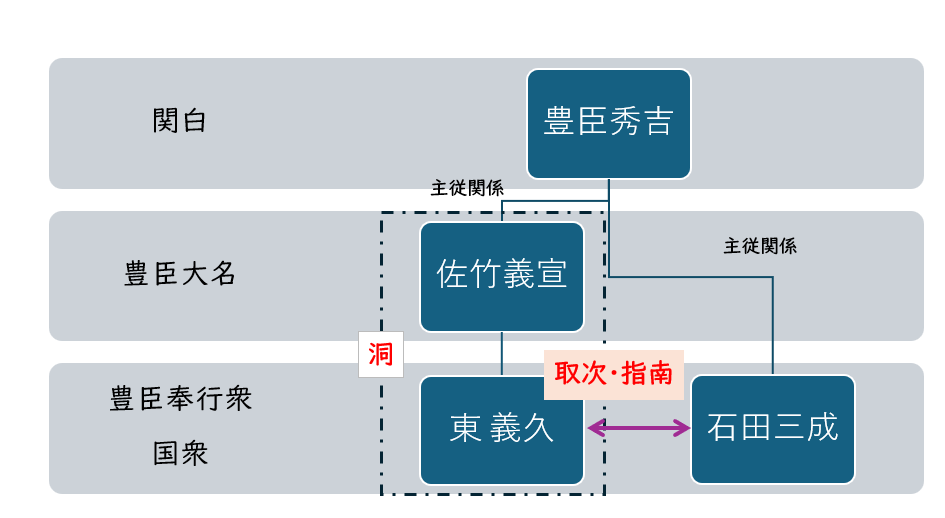 ところで小田原北条氏を除く東国戦国大名は血縁・地縁的結合関係によって領域集団を結んでおり、佐竹氏もその例外ではなかった。「洞」(うつろ)と呼ばれるものがそれに当たる。下図3で佐竹義宣と東義久との関係を「主従関係」のように位置づけたが、正確には家臣たちの独立性の高い盟約的、誓約的関係だった。そのため「洞中」内での紛争も絶えなかった*17。